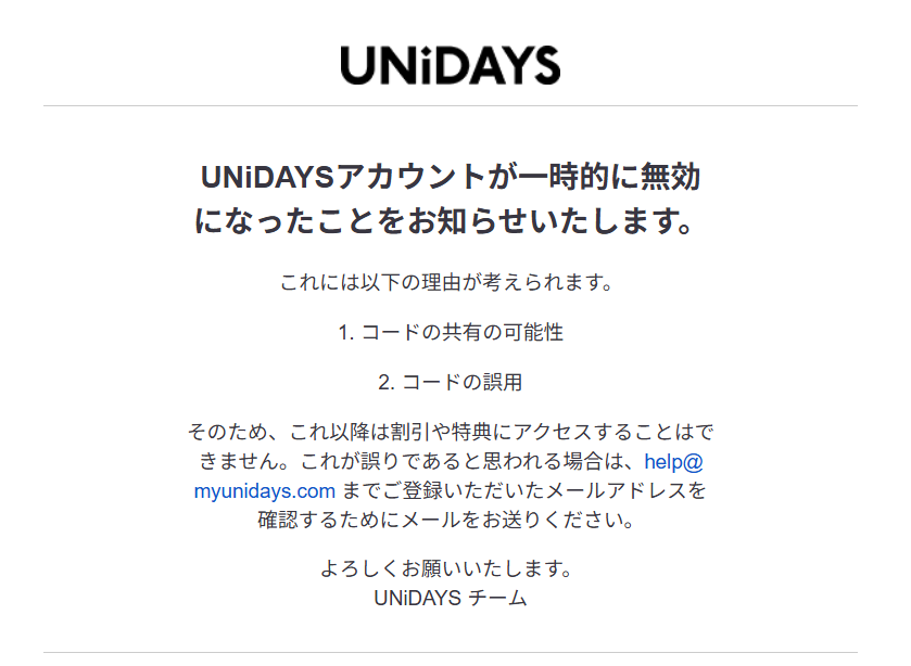 あるとき、UnidaysのアカウントからApple学生・教職員ストアにアクセスしようとすると、アカウントが一時停止されてしまいました。